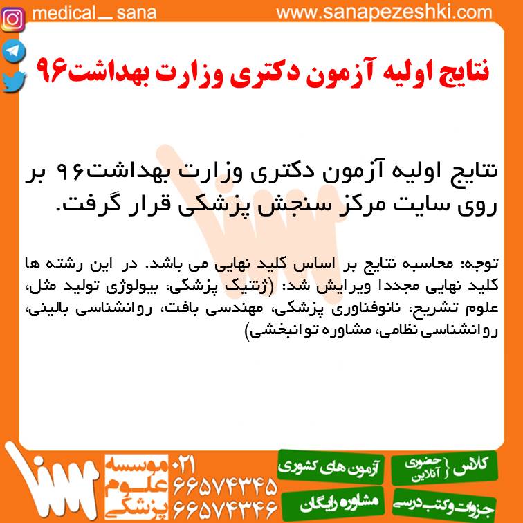 نتایج اولیه آزمون دکتری وزارت بهداشت 96-97 اعلام شد. نتایج اولیه آزمون دکتری وزارت بهداشت96 بر روی سایت مرکز سنجش پزشکی قرار گرفت.
